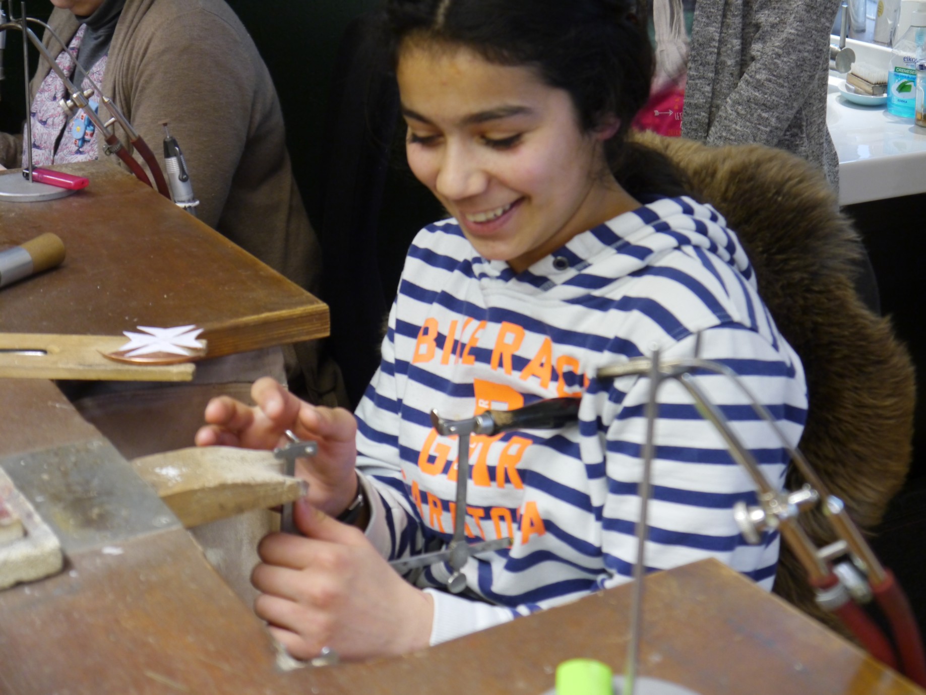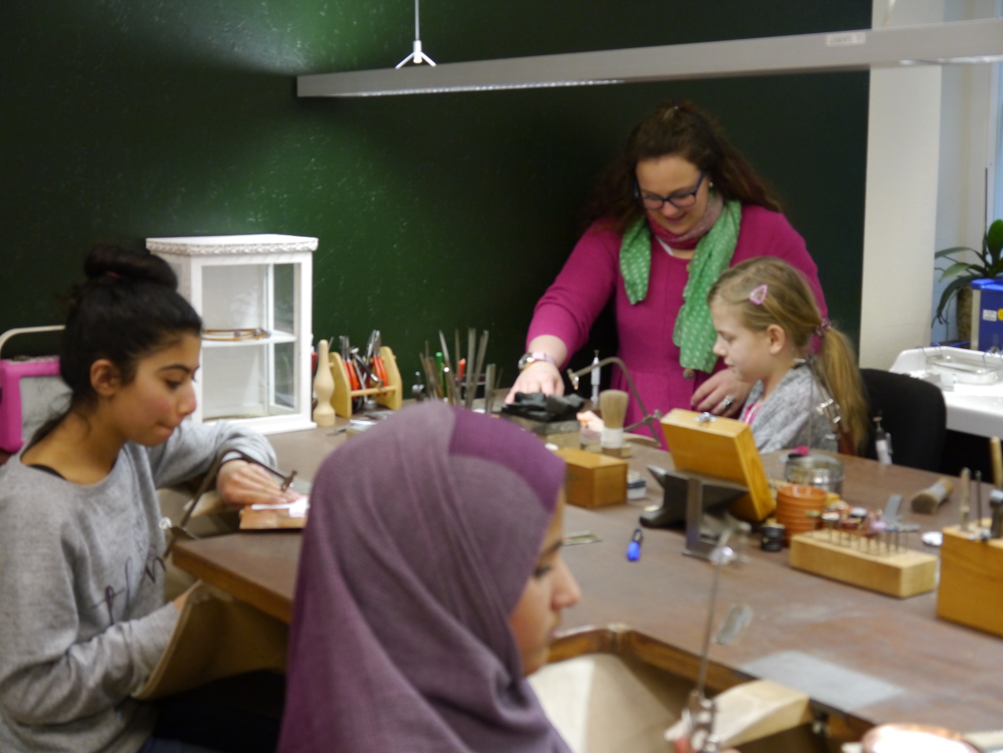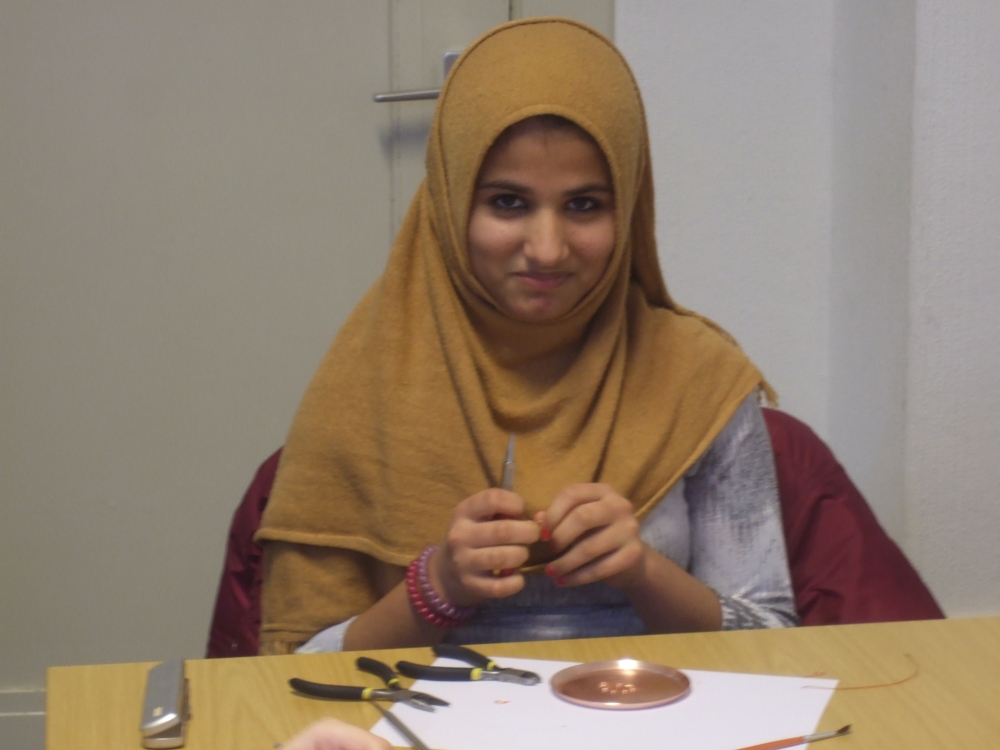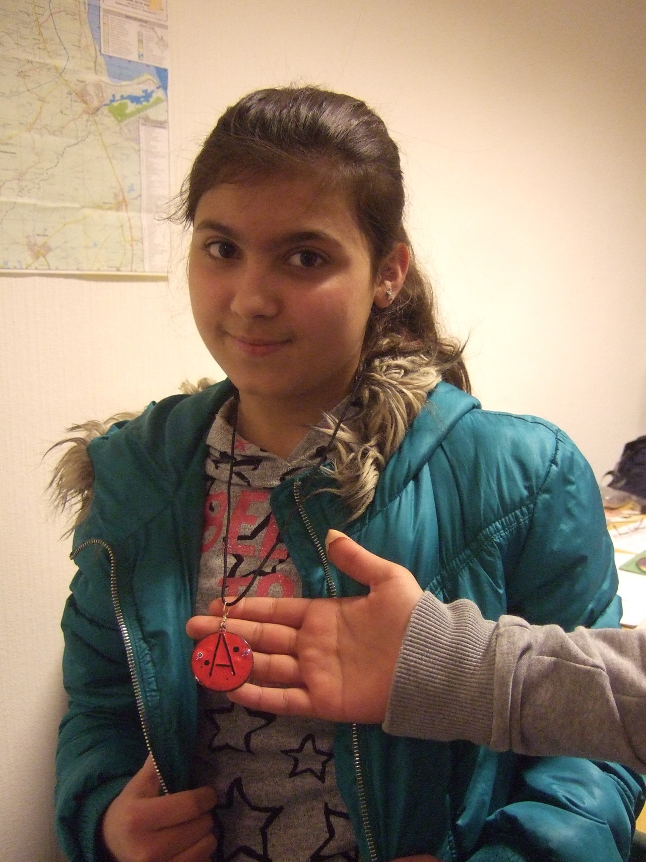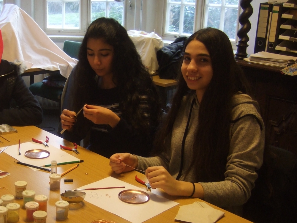 2. Hallo, wir sind Aya und Leyla. Wir kommen aus Syrien und wir wohnen jetzt in Hohenkirchen. Wir kommen jeden Donnnerstag und jeden Freitag ins Schloss. Was machen wir im Schloss? Wir machen Schmuck aus Metall, z.B. Ringe oder Ketten oder Armbänder. Wir waren auch schon einmal bei Lea Körfer in ihrer Goldschmiede. Jetzt gerade arbeiten wir mit Emaille, das ist ein Pulver aus farbigem Glas. Daraus machen wir uns Kettenanhänger. Und wir finden das Schloss GEIL.