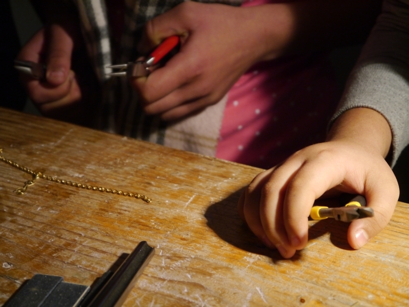 Weitere prunkvolle, wehrhafte und glitzernde Objekte aus Edelmetall, Eisen und Messing lassen sich aufspüren. Auf Bildern und Gemälden werden Schmuckgegenstände bedeutungsvoll inszeniert oder selbstverständlich zur Schau getragen. Angeregt von unseren Fundstücken, stellen wir mit Biegen, Sägen, Feilen und Schleifen erste eigene Schmuckstücke und Metallobjekte her.