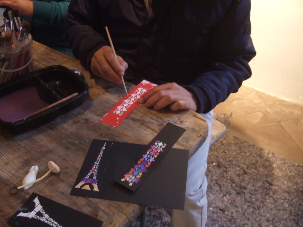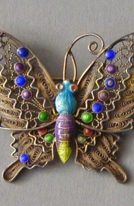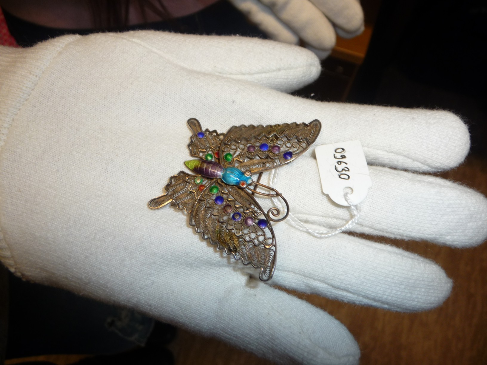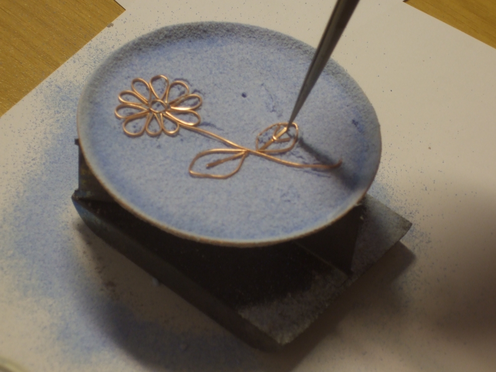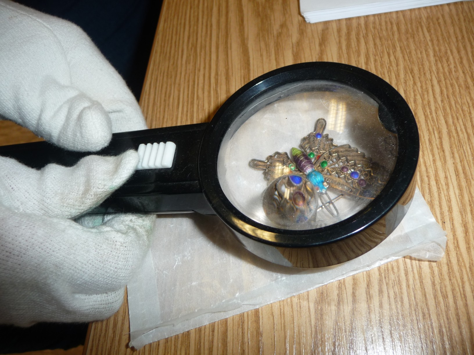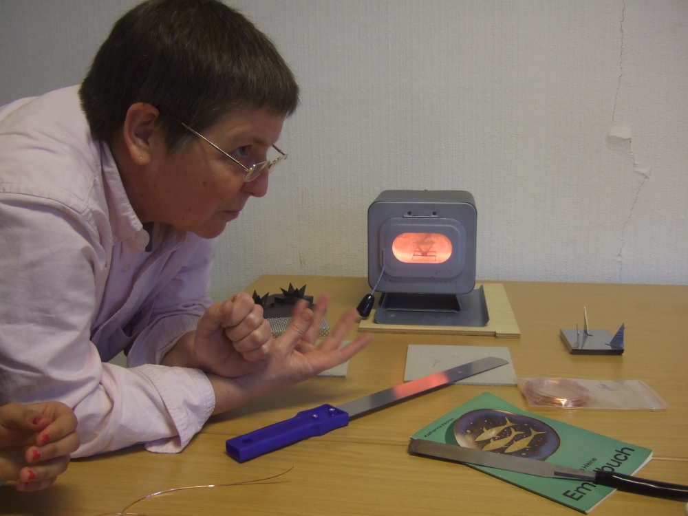 Die vielen Orden an der Kleidung der Männer und Frauen auf den Gemälden im Schloss und die Schmetterlingsbrosche mit ihren leuchtenden Farben aus der Sammlung haben uns zu der Frage geführt, um was für ein Material und was für eine Technik es sich dabei handelt. Ursula Lücke leitet uns Schritt für Schritt dabei an, wie wir aus Kupferplatten und einen pulverisierten, glasartigen Schmelzgemisch eigene Schmuckstücke machen können.