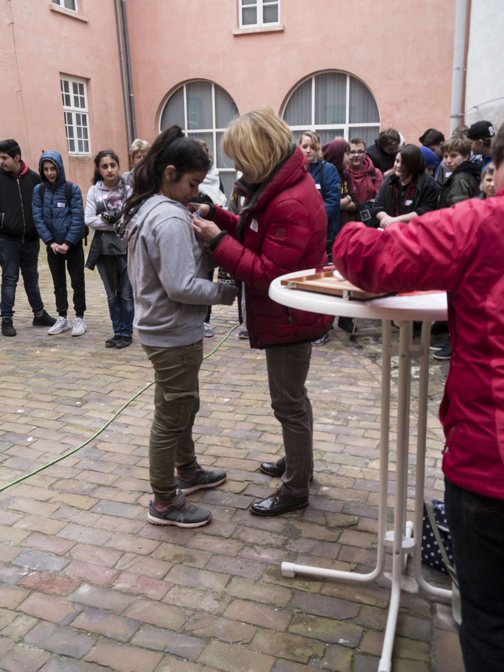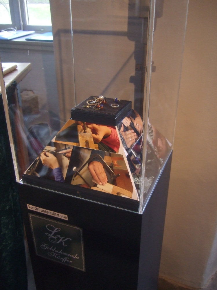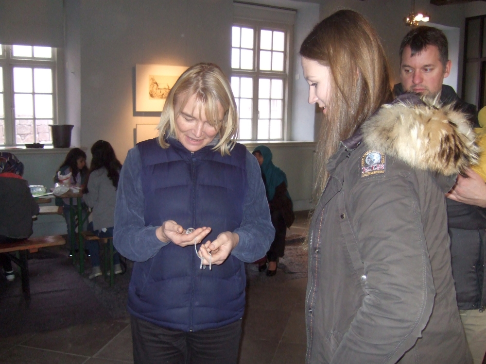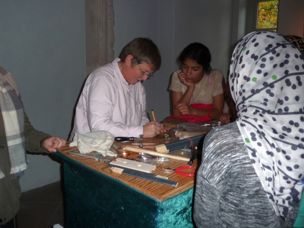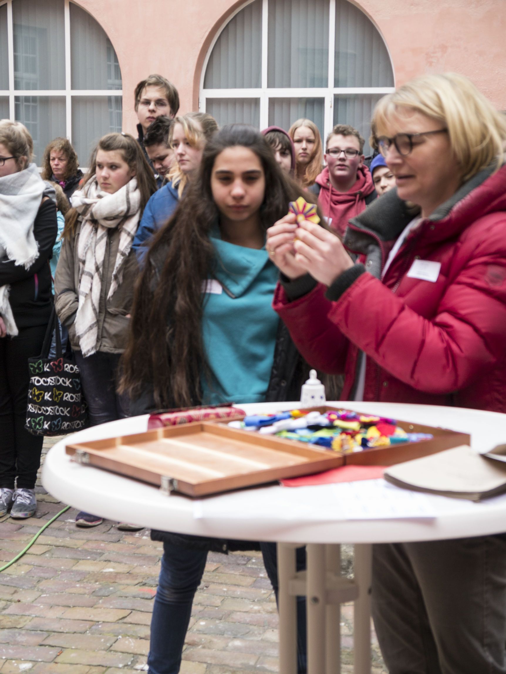 Am Tag der offenen Tür zeigen wir unseren Eltern, Freunden und Lehrerinnen zum ersten Mal das Schloss, das wir nun schon in- und auswendig kennen. Den vielen Interessierten erläutern wir die Herstellung unserer Schmuckstücke anhand der ausgestellten Fotos und der selbst gestalteten Anhänger und Ringe. Ganz selbstverständlich erfahren die Besucherinnen und Besucher etwas zu den Metallgegenständen der Frauen, die im Schloss lebten.