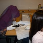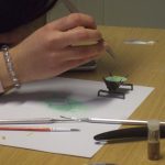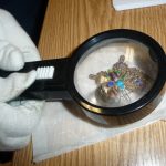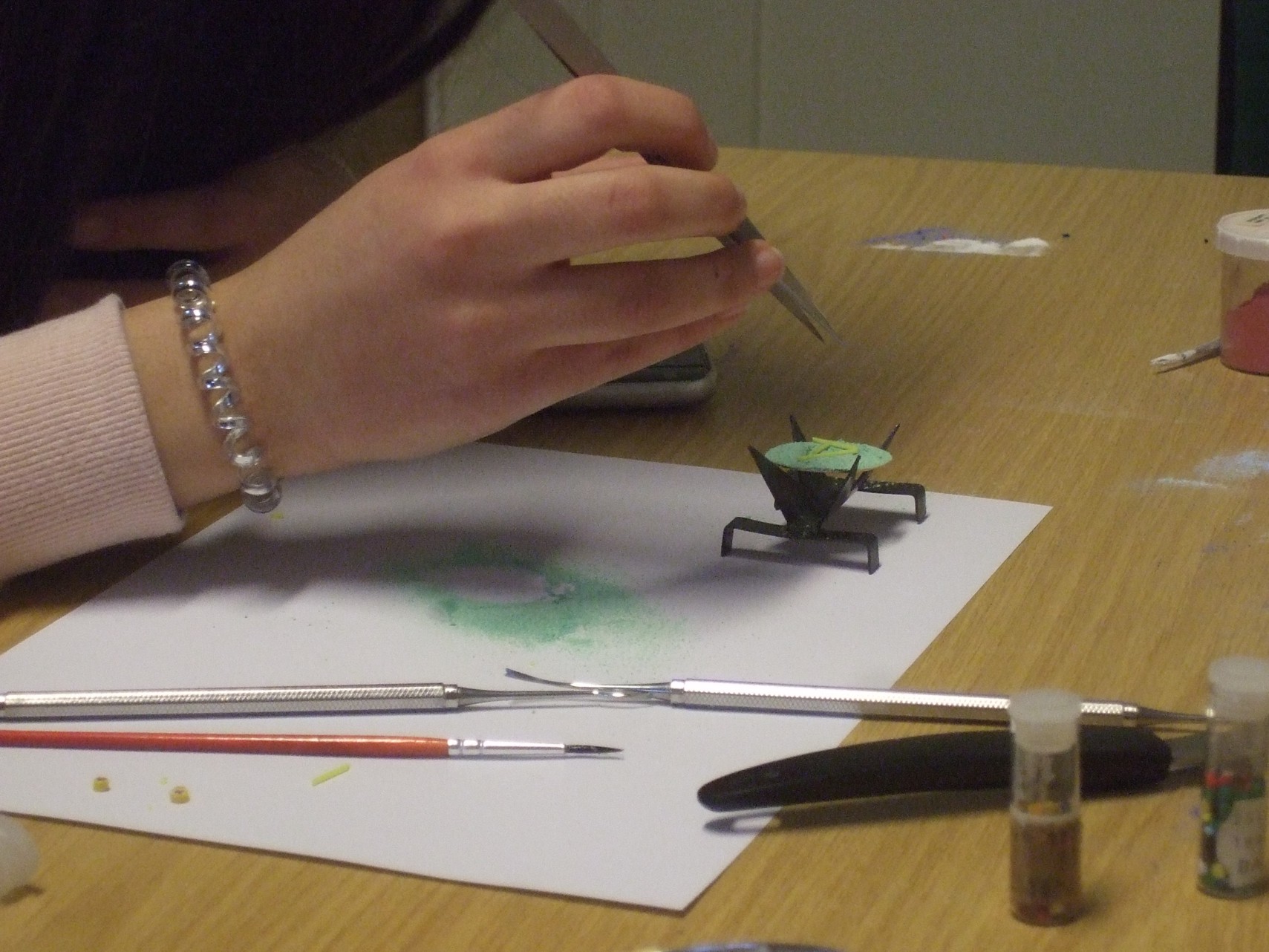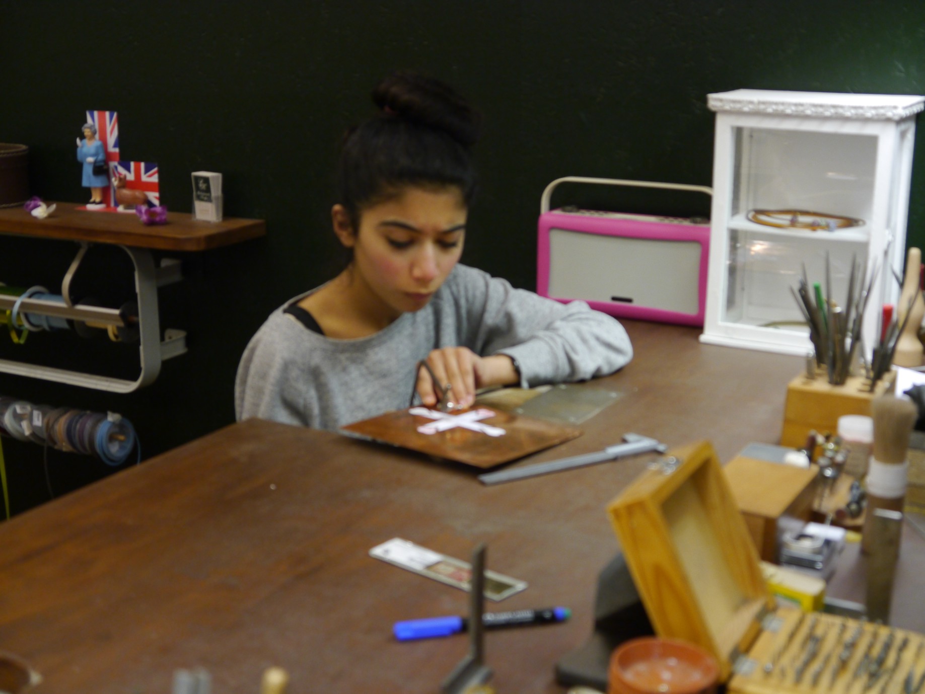 In der Goldschmiede von Lea Körfer und mit ihrer Unterstützung setzen wir unsere zuvor entworfenen Ordenskizzen in Kupfermetall um. Danach werden sie von uns aufwendig emailliert, um sie abschließend an Büsten drapiert bei der Ausstellung zu unserer Projektpräsentationsparty in Vitrinen effektvoll inszeniert zu präsentieren. Nicht fehlen dürfen unsere Forschungsergebnisse zu den zwei Orden der Katharina von Russland. Wir planen die Hängung, die Tafelbeschriftung und dann werden die Vitrinen eingeräumt.
