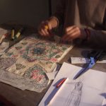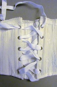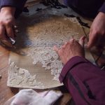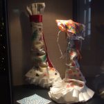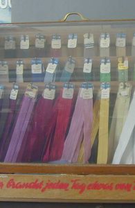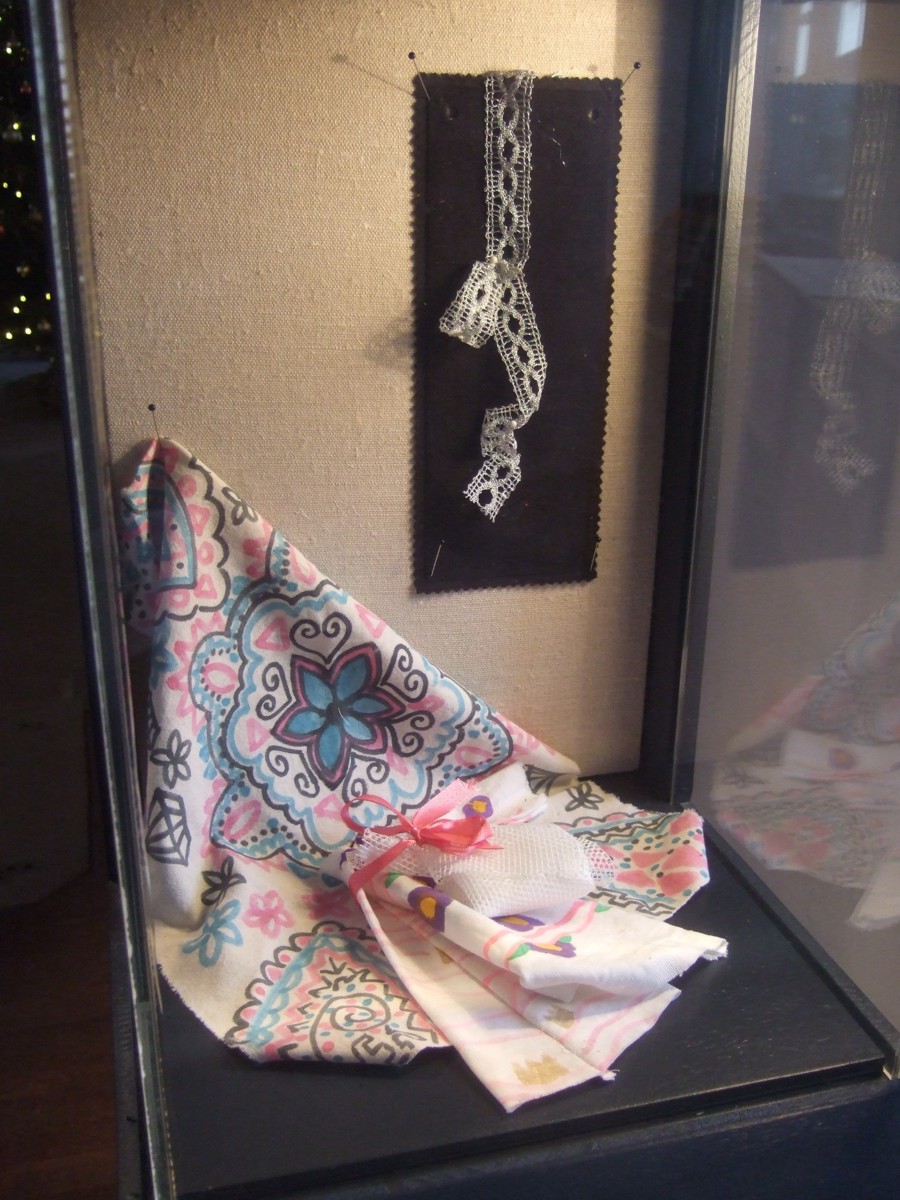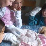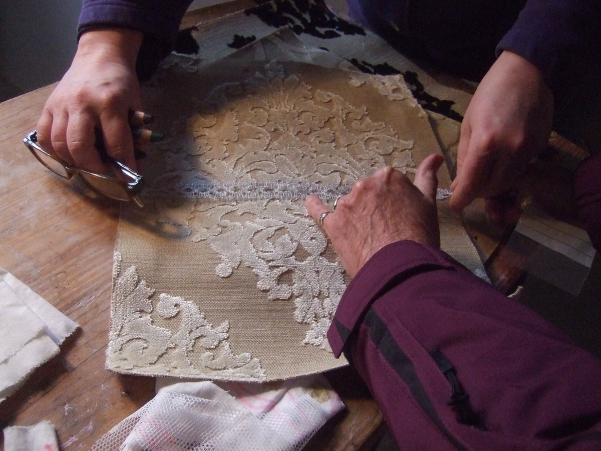 Spitze, Samt, Seide oder Brokat: Mit Fotoapparat und schwarzem Rahmen sind wir im Museums als Stoff- und Musterdetektivinnen unterwegs. Wir suchen nach Kleidungsstücken, die es heute nicht mehr gibt, die in früheren Epochen aber ein absolutes Muss der Frauenkleidung waren, wie z.B. der elegante Stecker und die vielen mit Spitzen besetzten Hauben. Anne Niendiek, die noch Spitzenklöppeln kann, lädt uns zu einer Runde ‚testklöppeln‘ ein. Es macht Spaß und es sieht sogar ziemlich gut aus, aber es braucht einen ganzen Nachmittag bis wir wenige Zentimeter Spitzenborte fertig haben.