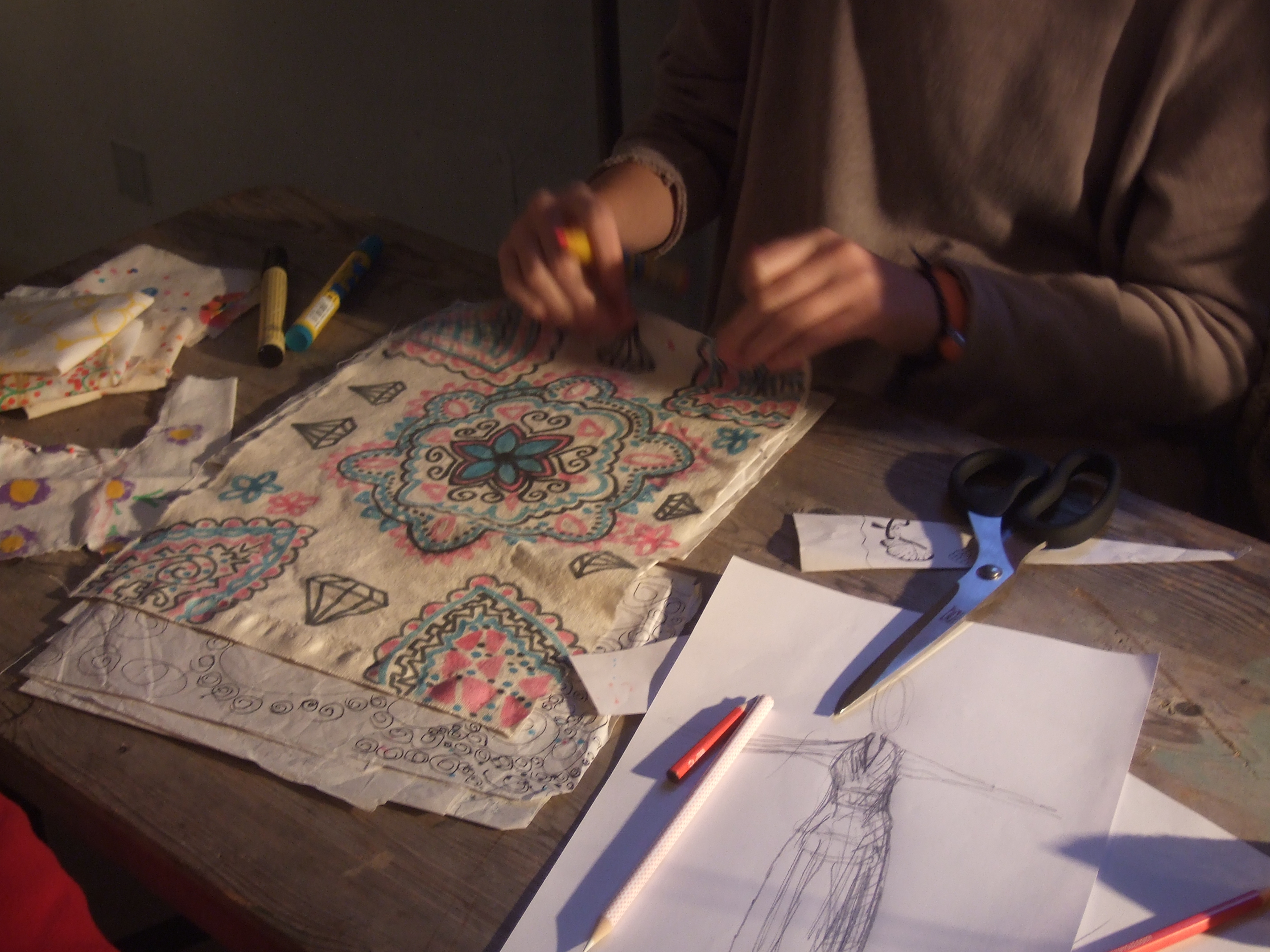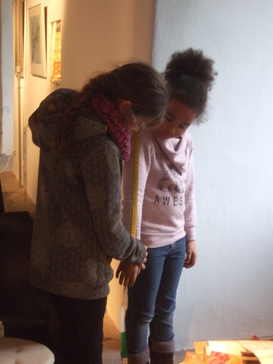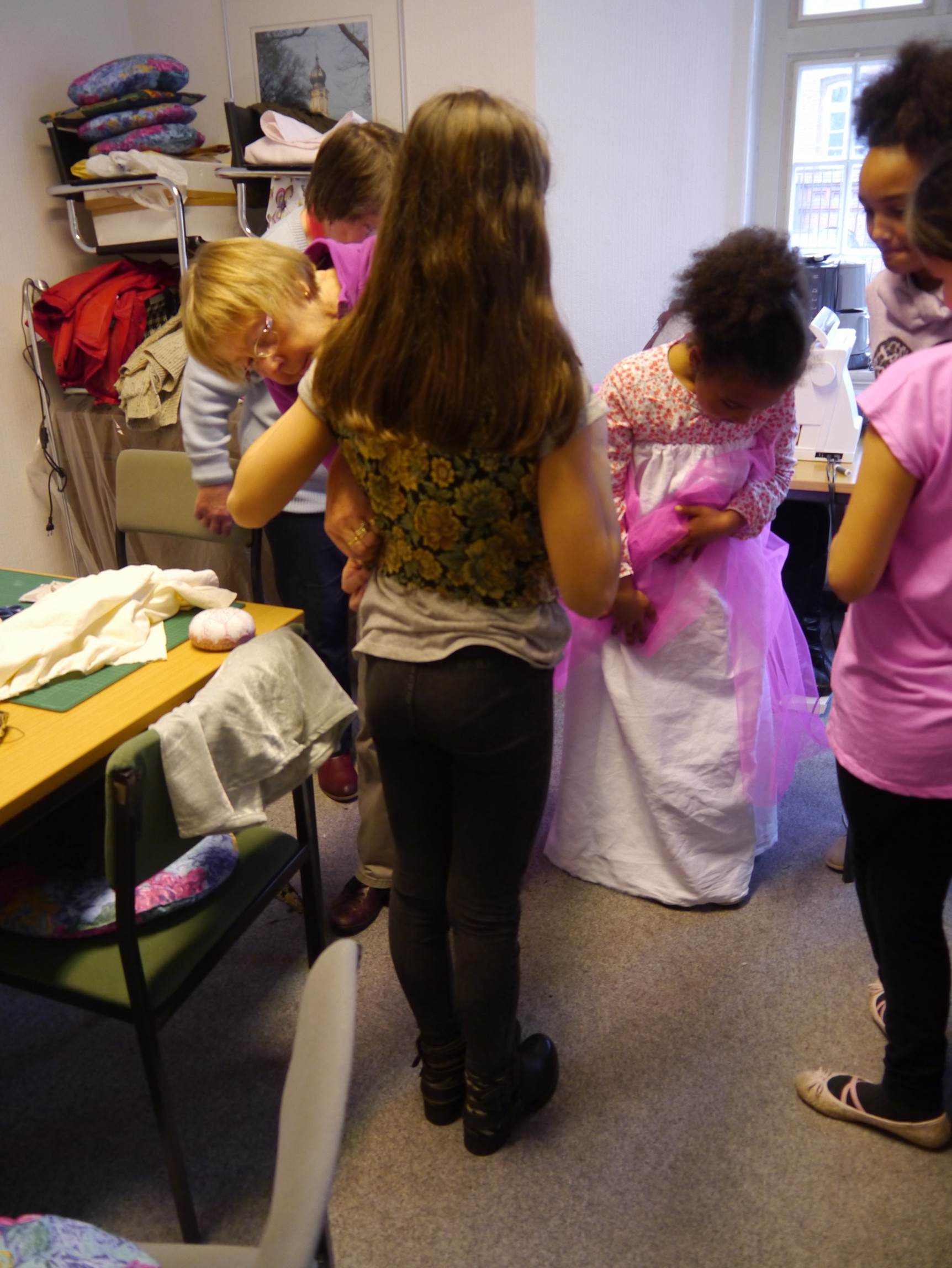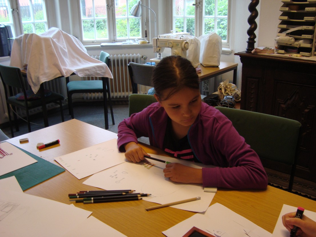 Wir gehen nicht nur der Frage nach, welche Frau aus Jever was getragen hat, sondern wir probieren auch erste, eigene Stoffmuster und kleine Kleiderentwürfe aus: Kleidung die alles andere als von der Stange ist. Ausmessen, Notieren, Ausschneiden und Kostümieren, sind unsere nächsten Schritte, mit denen wir uns Stück für Stück mit Blick in die Kostümgeschichte zurück einem Unikat nach unserem Geschmack annähern.