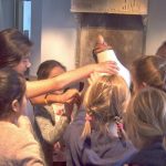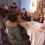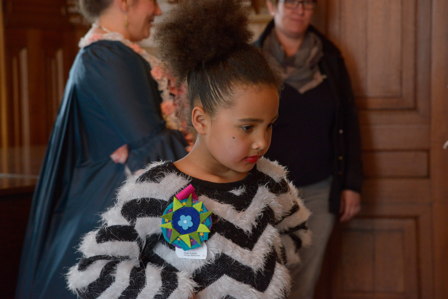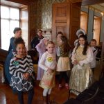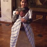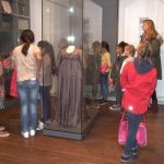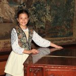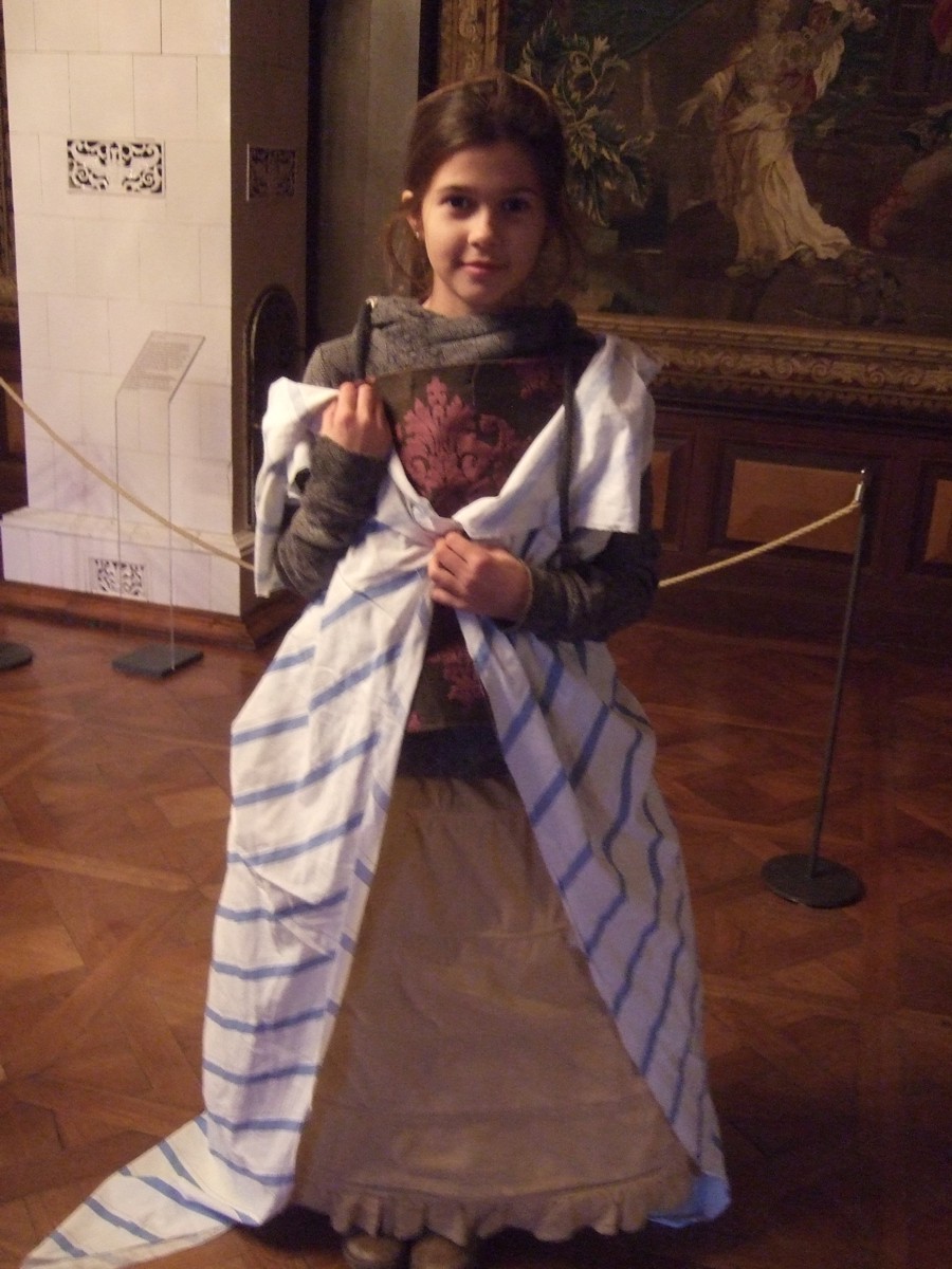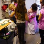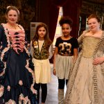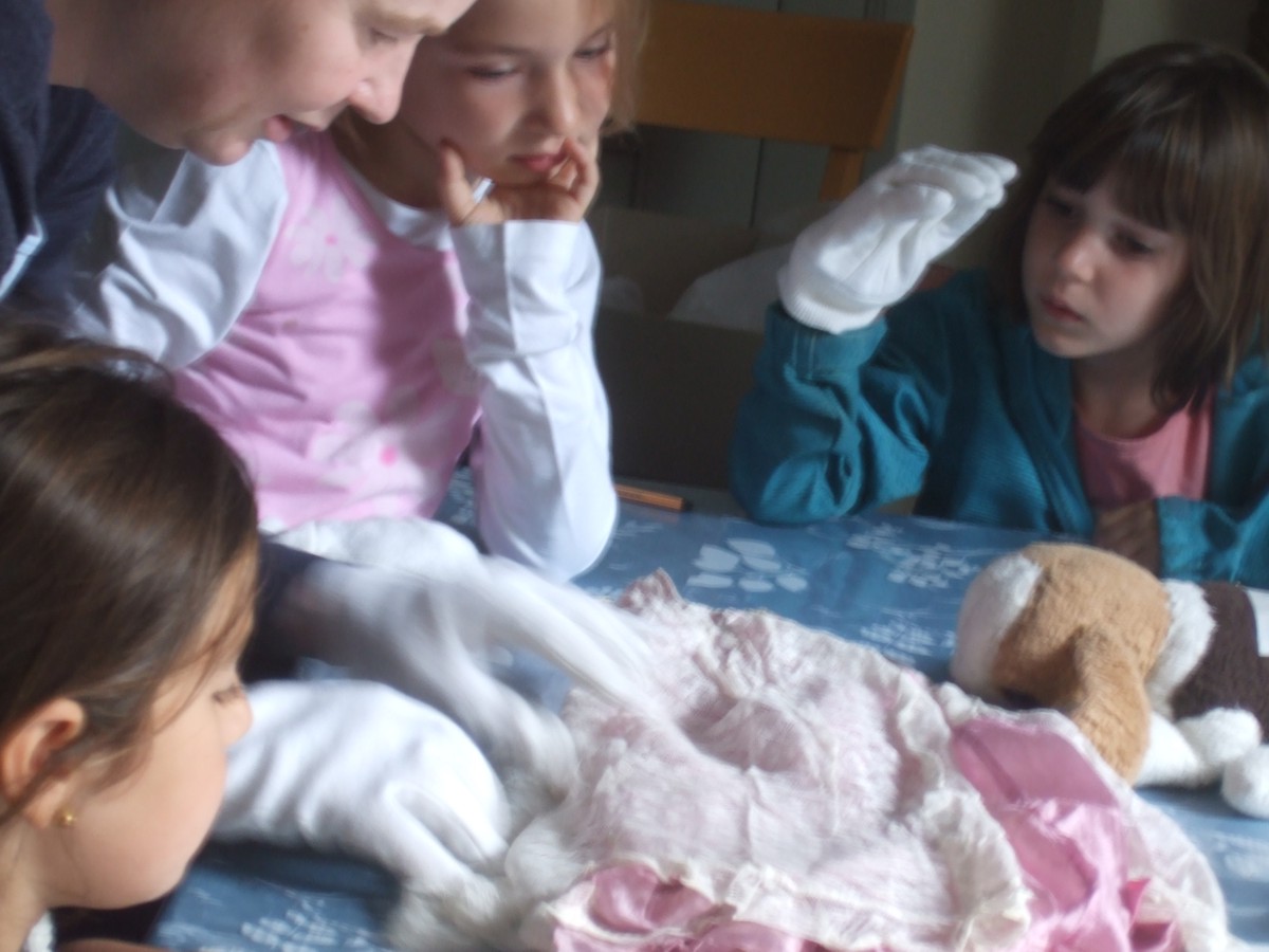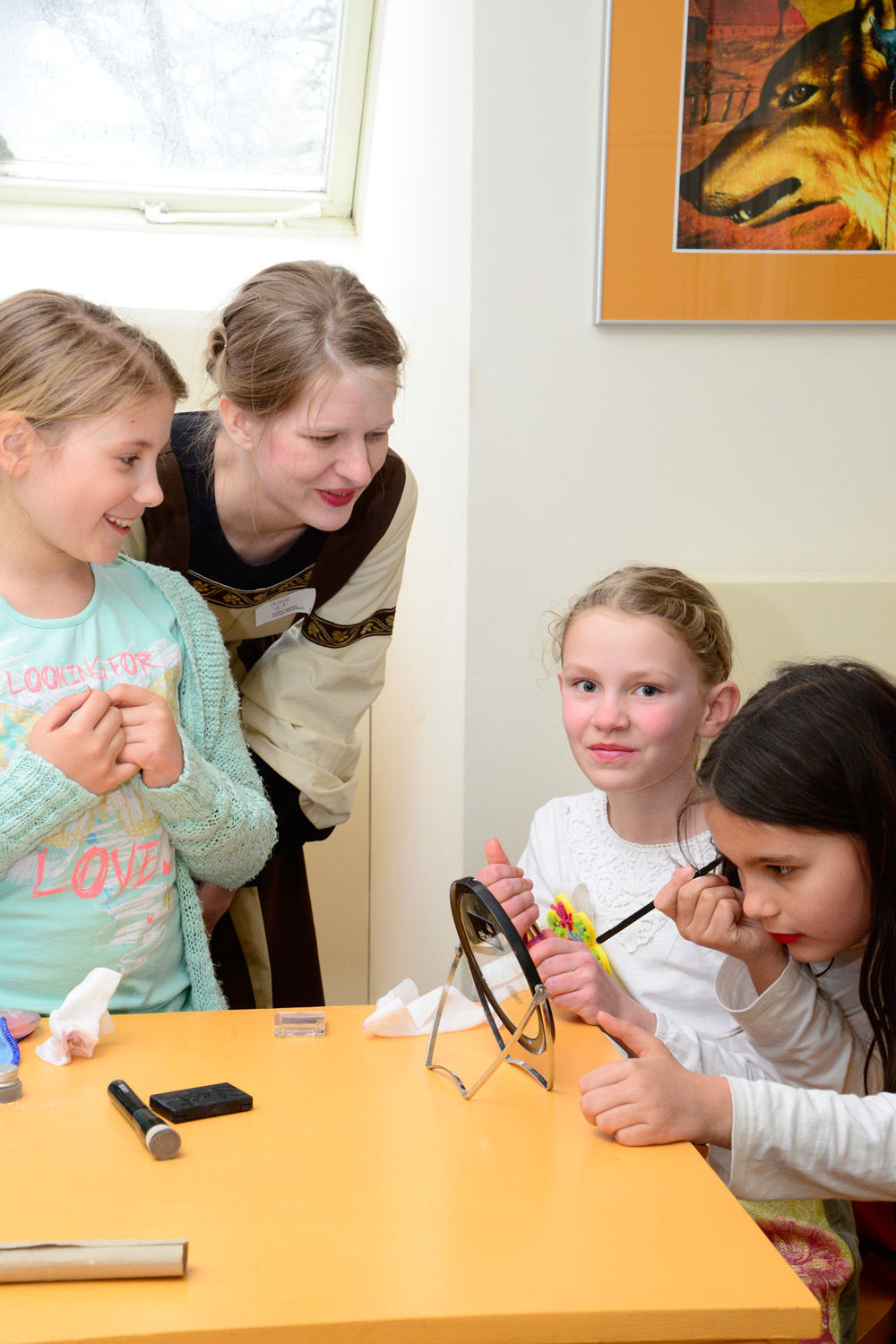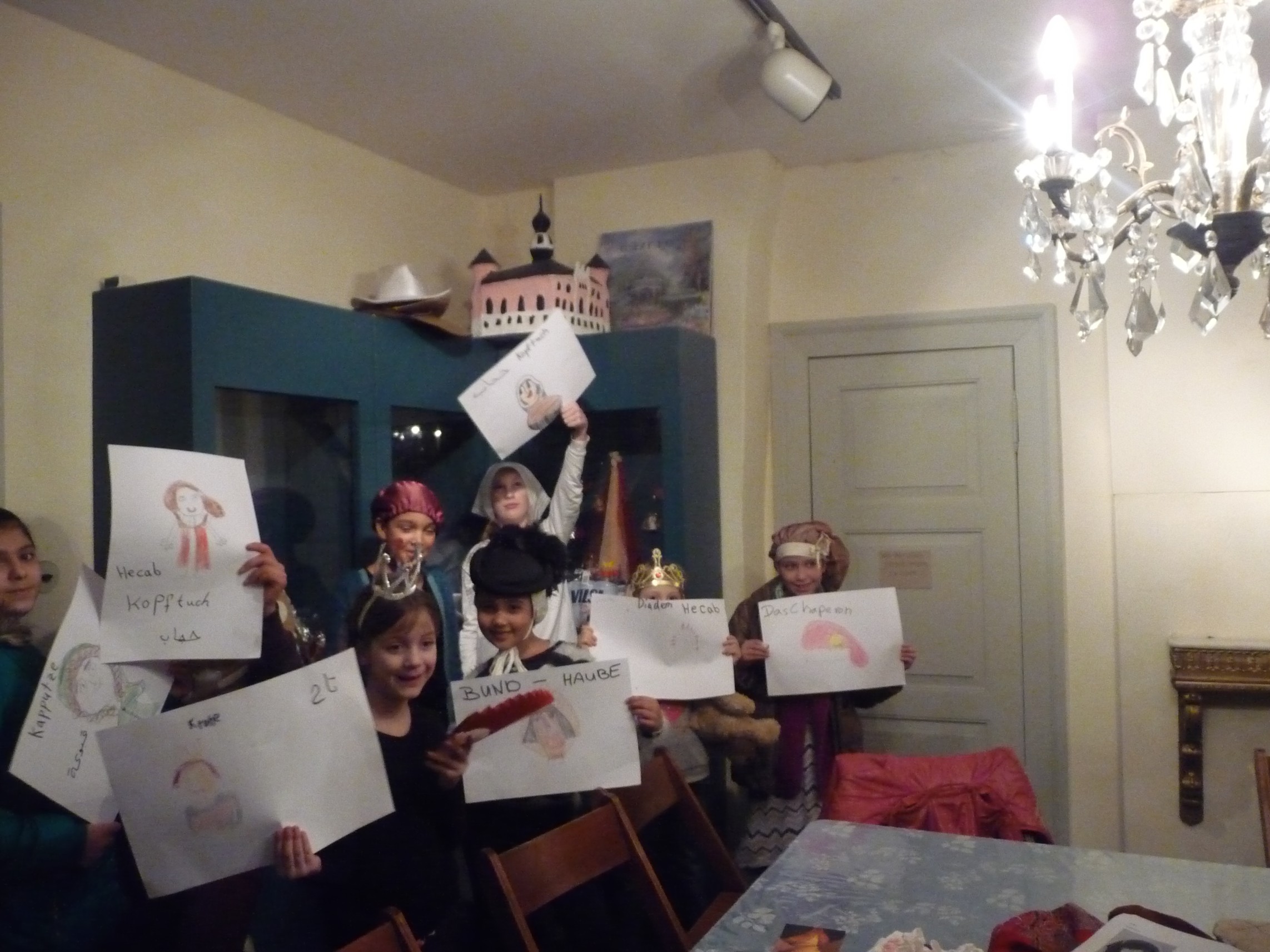 Wir laden gemeinsam mit den Schlossnäherinnen unsere Familien, Freunde und Mitschüler zur großen Präsentationsparty ein – sogar einige Lehrerinnen und Lehrer sind mitgekommen. Die Museumsleiterin Frau Prof. Dr. Sander überreicht jedem von uns die Expertinnen-Verdienstorden. Dann wird es ernst: wir präsentieren unsere selbst entworfenen und genähten Kleidungsstücke echten Kostümexpertinnen. Dann führen wir kleine Gruppen, da so viele gekommen sind, durch unser Schloss. Im Angebot haben wir gemeinsam mit den anderen zwei Gruppen auch kleine Aktivangebote zum Spielen, Nähen und Ketten gestalten – die Projektausstellung mit unseren Ergebnissen zur Frauenkleidung am Beispiel von Marias Haube nicht zu vergessen!