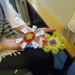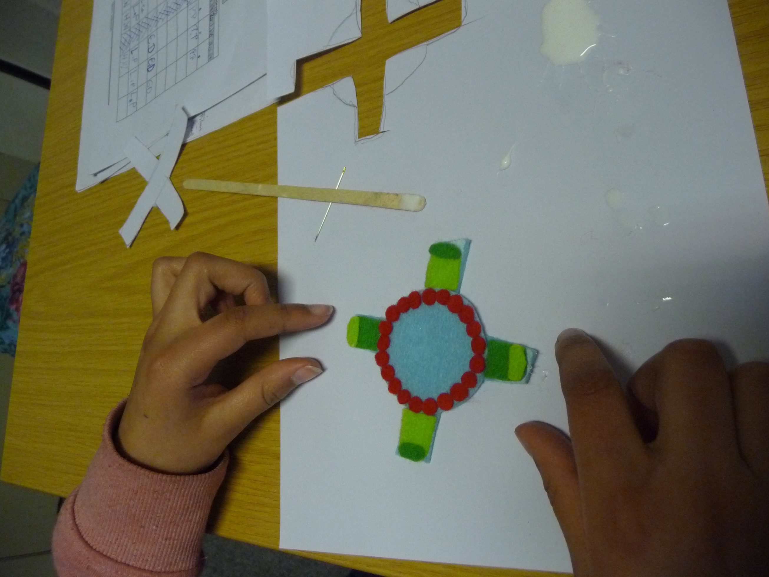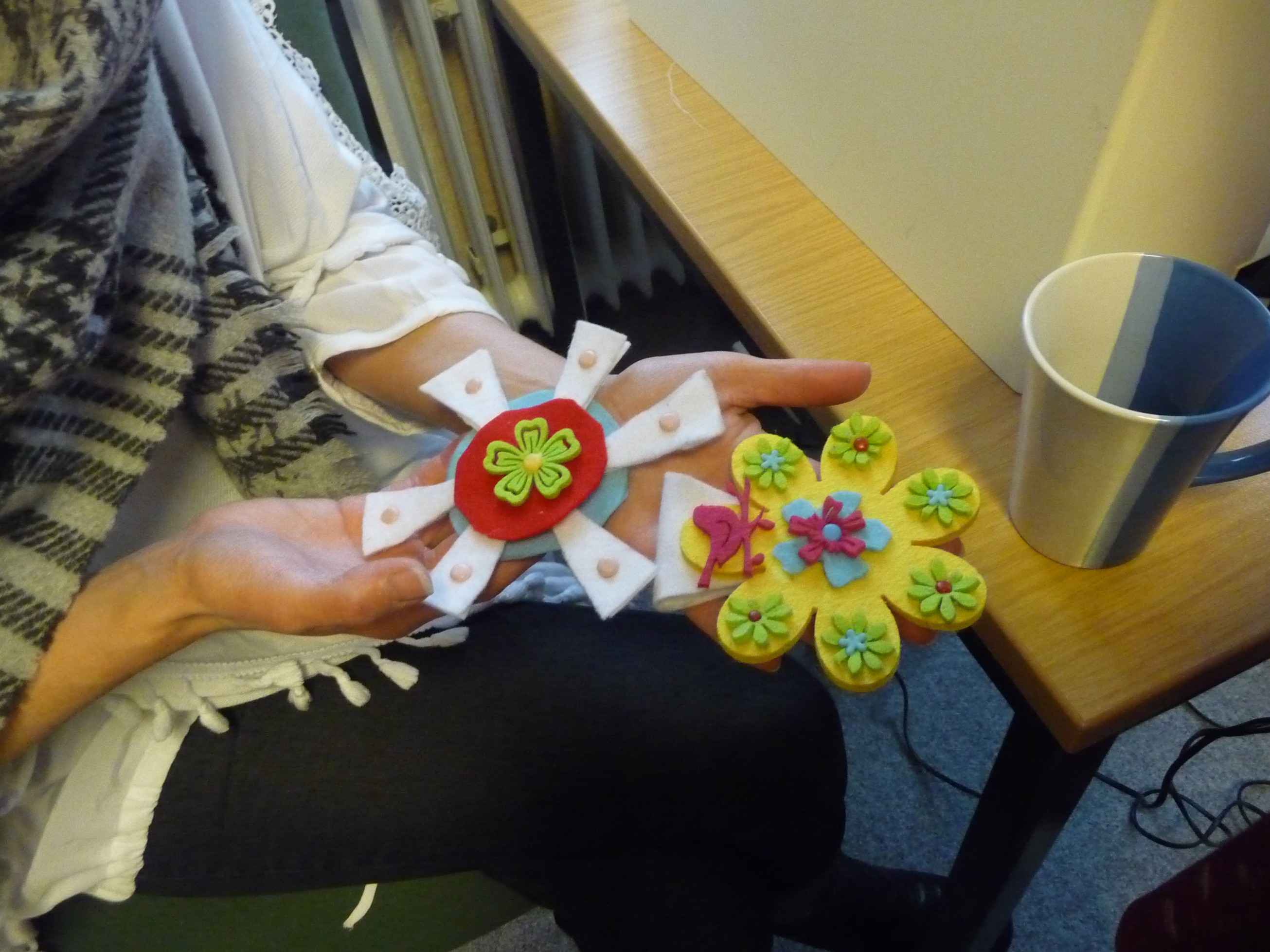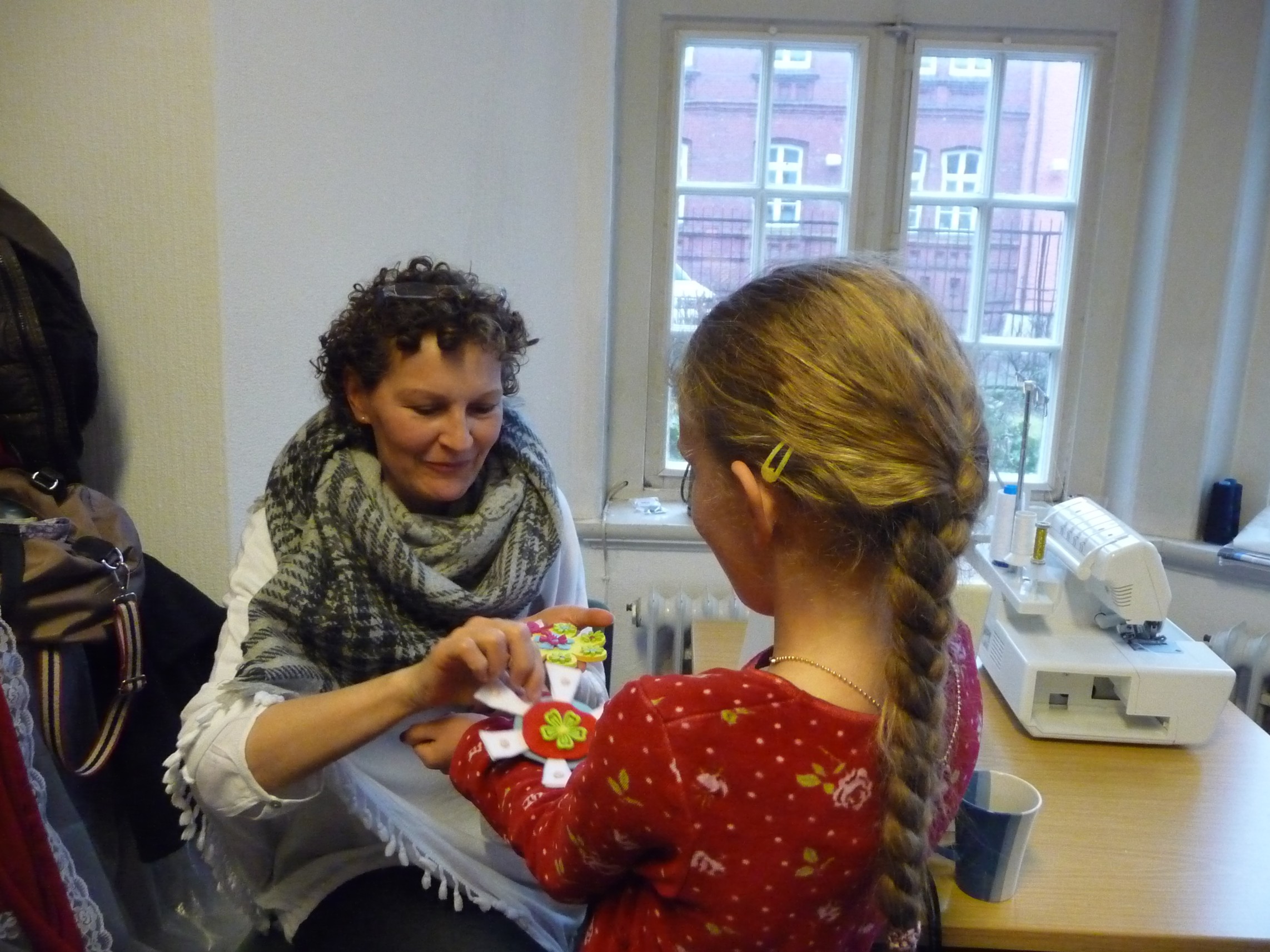 Gemeinsam überlegen wir, was wir anderen über das Schloss und die wichtigen Frauen, die darin lebten mitgeben wollen. Zu unseren Treffen laden wir, wann immer möglich, Freundinnen, Familie und Bekannte ein, denen wir vorab zeigen und erzählen, was wir im Schloss alles erlebt und gesehen haben. Zur Abschlusspräsentation planen wir Aktivstationen mit unseren Spielen und Schlossführungen. Gruppenverbindendes: selbstgestaltete Orden aus Stoff – da wir zu diesem Anlass von der Museumsleiterin Frau Sander unseren eigene Schlossexpertinnen-Verdiensturkunde verliehen bekommen sollen, die auch unser personalisierter Museumpass ist, ‚filzen‘ wir uns, wie die anderen Mädchengruppen auch, den eigenen Verdienstsorden.